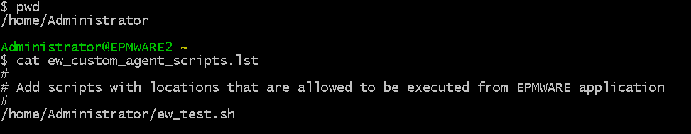 - On the target server, add the name with the full path of the script to be executed by this remote agent in the file “ew_custom_agent_scripts.lst”. This file is located in the home directory of the EPMware target Agent.