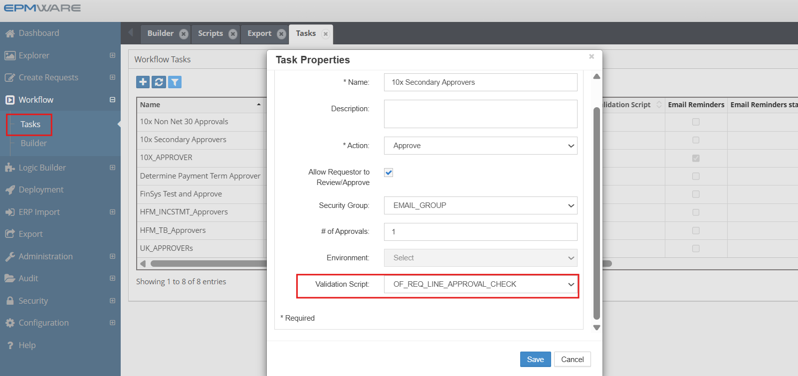 These scripts are assigned to Workflow Review or Approve tasks and are executed when the user approves a line or mass approves lines in a Request.