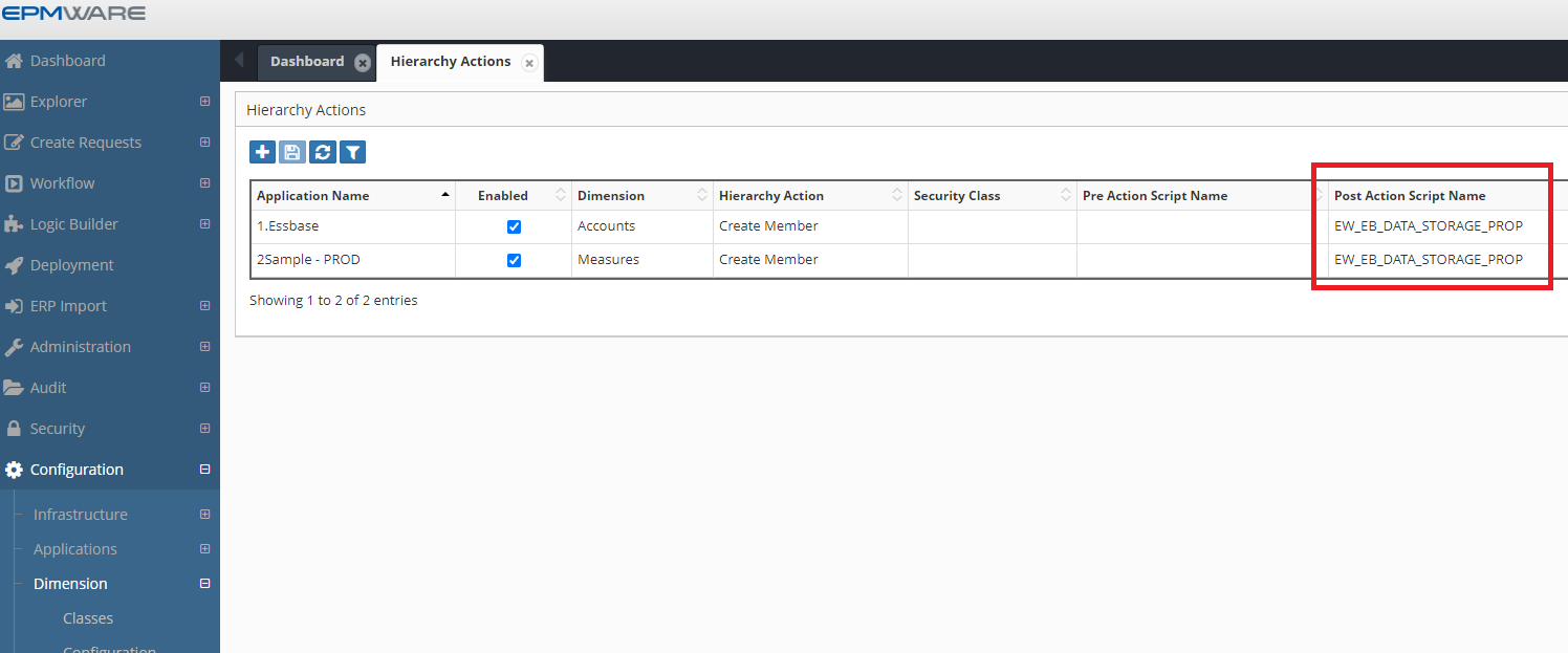 If a record for Pre hierarchy action has already been assigned and you need to assign a Post Hierarchy Action to the same dimension and action then you can combine these two actions for the same record in the “Hierarchy Action” configuration page.