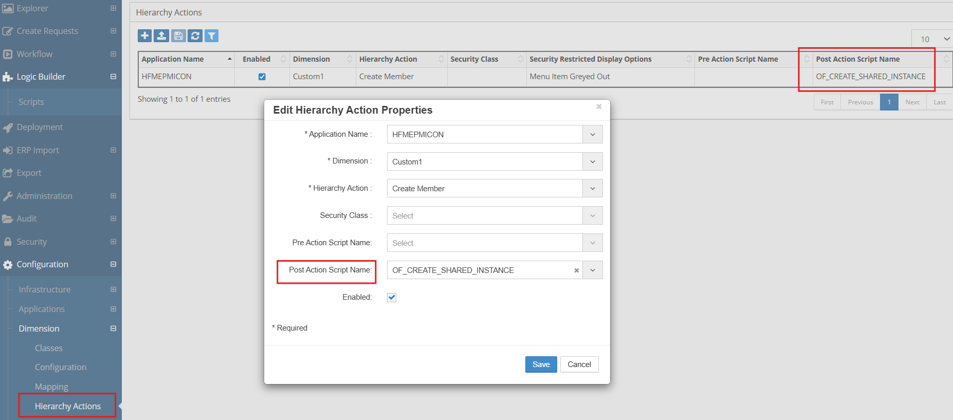 2.Assign this Logic Script in the Hierarchy Action menu option is under Configuration -> Dimension menu screen as shown below:
