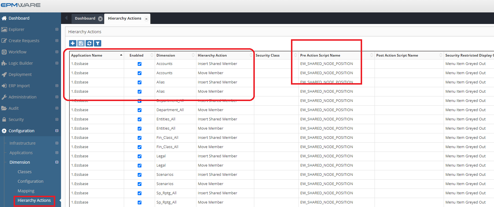 Pre-Hierarchy Actions are used when a logic builder script needs to be triggered before a hierarchy action is executed on the dimension in a Request. Pre-Hierarchy Action Logic scripts are associated with an application, dimension and a specific hierarchy action.