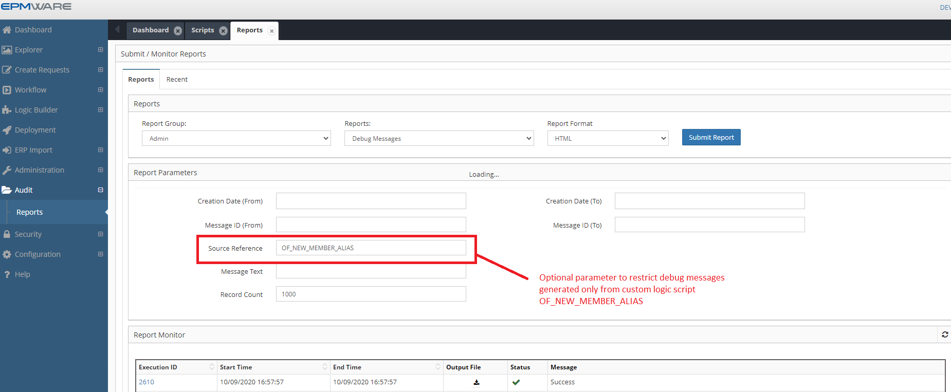 Once debug messages have been tagged using script names as a reference (OF_NEW_MEMBER_ALIAS), running the Debug Messages report will provide debug messages specifically from the script as shown below.