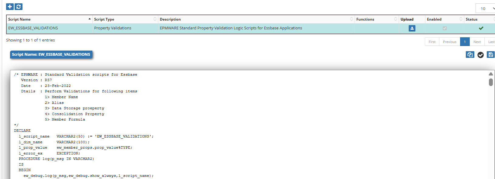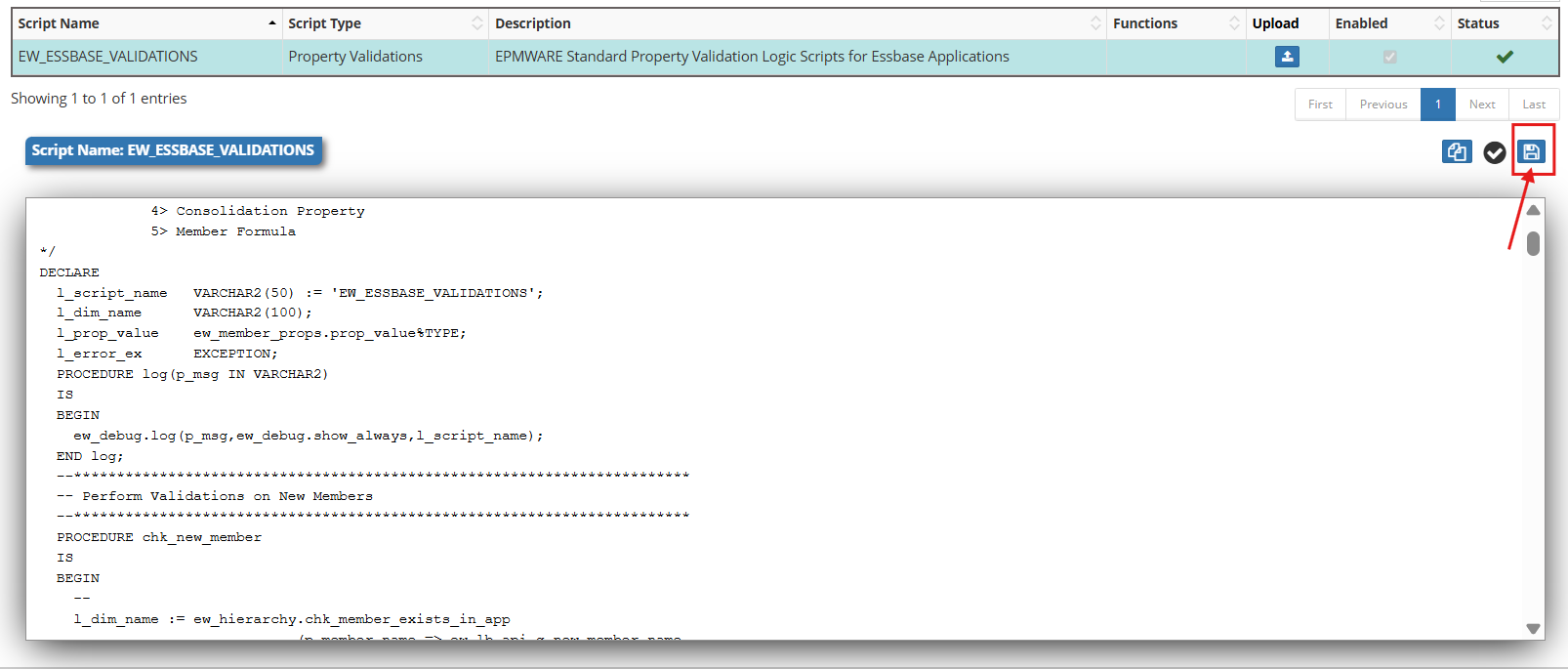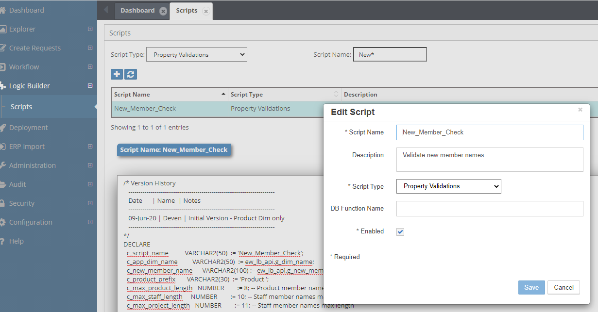 Clicking the Save icon automatically validates the script for any PL/SQL syntax errors. Business logic will still need to be tested by performing transactions in the application where the relevant Logic Script is applied.